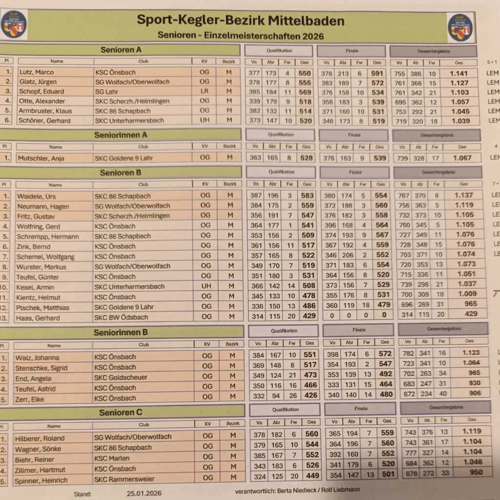 Bei den Senioren B lief es ebenfalls wechselhaft. Helmut Kientz (478 & 531 Kegel) blieb unter seinen Möglichkeiten und wurde am Ende Elfter. Wolfgang Schemel (522 & 552 Kegel) belegt Platz Sieben, Bernd Zink (517 & 559 Kegel) Rang Sechs und Gerd Wolfring (541 & 564 Kegel) verpasste als Vierter nur knapp eine Medaille.